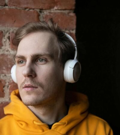 A modern workspace with a focus on technology. In the foreground, there is a black laptop with a distinctive logo placed on a table beside a smartphone propped on a stand. A man is sitting in the background, also using a similar laptop. The setting is minimalistic with a combination of white furniture and a textured brick wall.